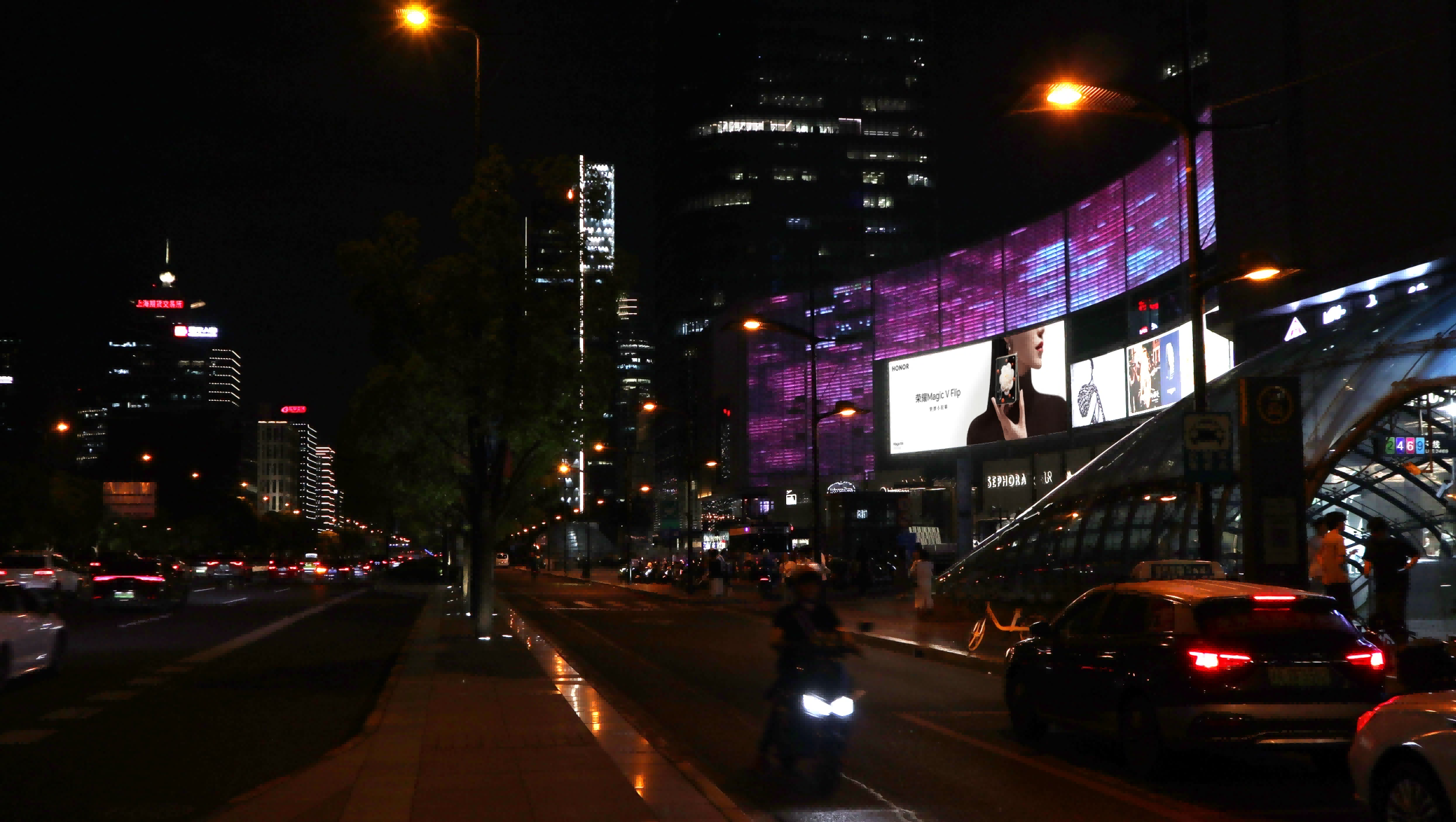 巨幕规格与画质:LED屏尺寸达42m宽×13m高(546㎡),采用高亮度、高刷新率技术,支持4K/8K动态视频播放,色彩鲜艳,视觉冲击力强,确保广告内容在明亮环境下清晰可见。