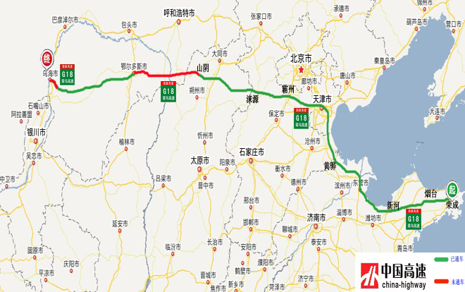 荣(荣成)乌(乌海)高速公路(编号G18),属于国家高速公路网规划的一条东西横向线。途径荣成-威海-烟台-新河-东营-黄骅-天津-霸州-涞源-灵丘-浑源-朔州-鄂尔多斯-乌海,全长1820公里。