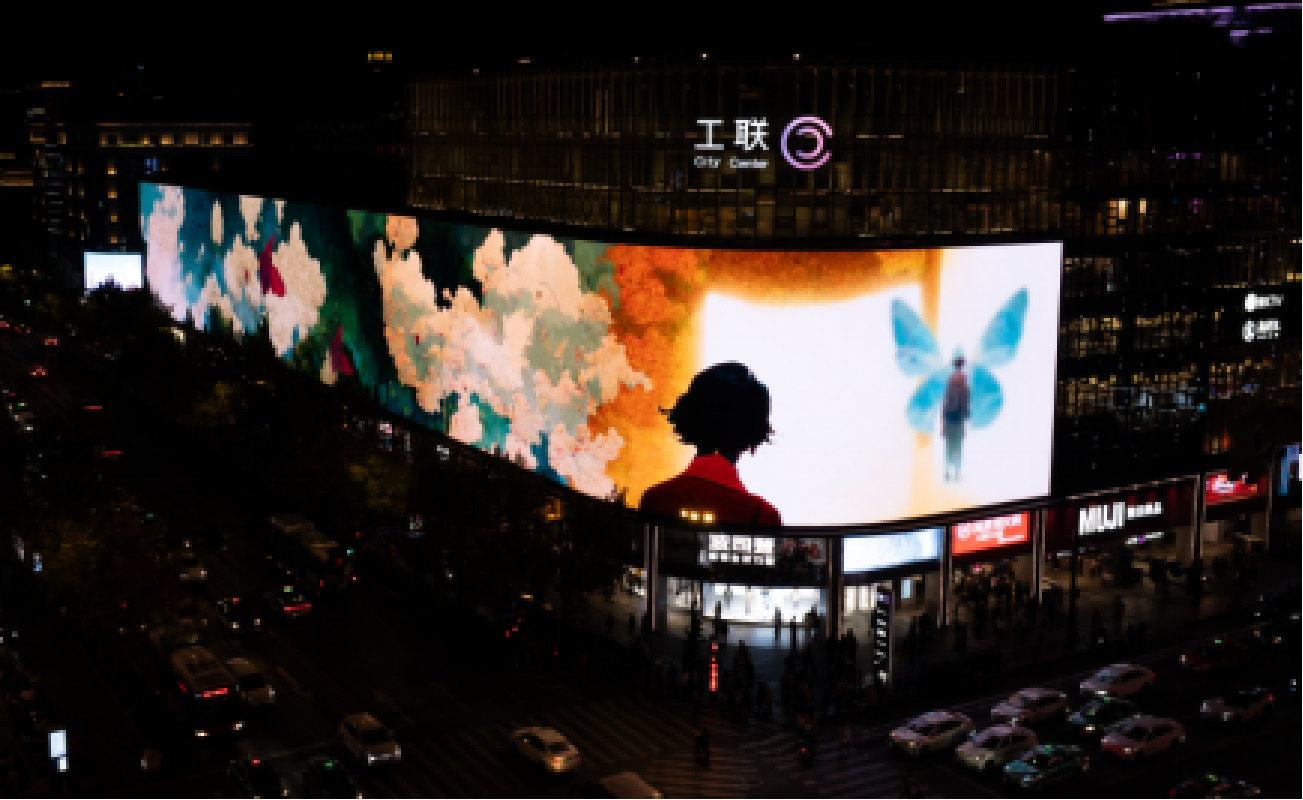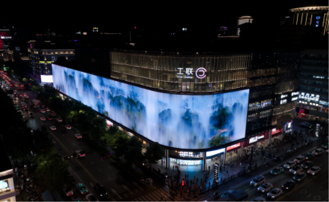 超大屏幕与高精度技术:屏幕面积达3060㎡(170m×18m),分辨率达P8精度,支持裸眼3D、动态视频、AR互动等多元形式,视觉效果堪比纽约时代广场纳斯达克大屏,是亚洲最大户外高清LED屏之一。对比普通商场室内屏(约40㎡),其规模是后者的76倍,能瞬间吸引路人目光,形成“强制观看+高频记忆”效应。